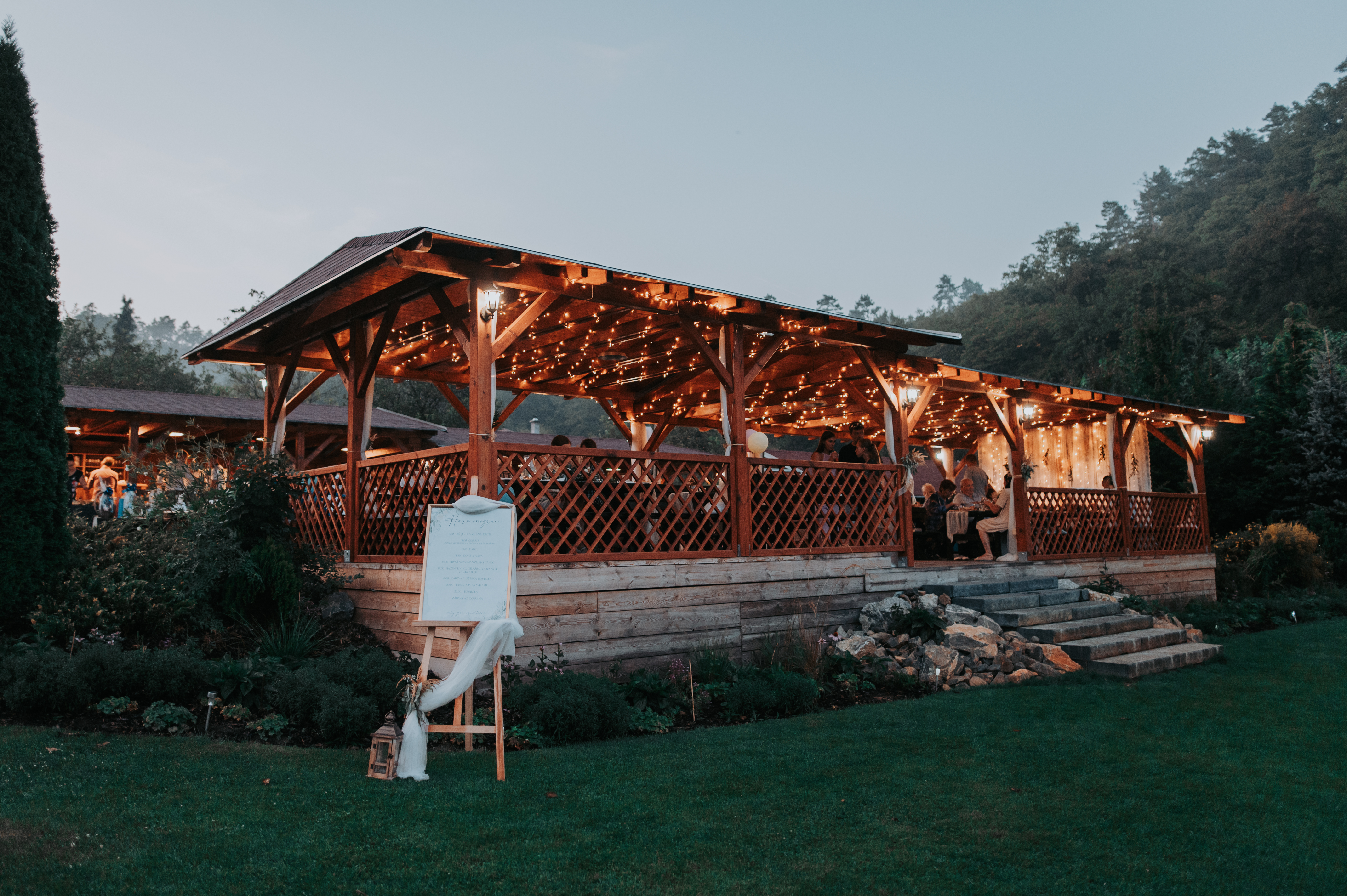 Penzion zajišťuje předání kontaktu na catering, cukráře, fotografa, hudbu apod. Po domluvě můžeme připravit obřad včetně inventáře, připravit svatební tabuli, zapůjčit inventář včetně dekorací, zapůjčit gril, zajistit snídani pro ubytované hosty.